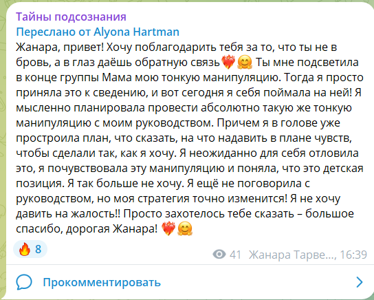 В группе проработка идет намного быстрее, потому что твоя деструкция проживается многими участницами и скорость выхода из симптома ускоряется.